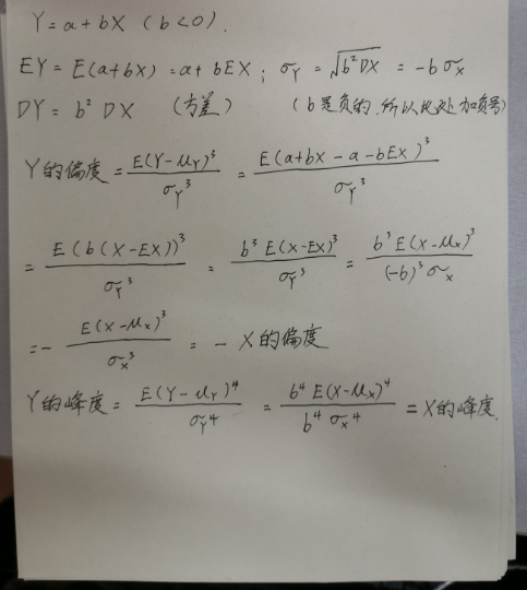 C、D是讲偏度和峰度的,推导公式我给您列在下面了。其实这道题根本不用算,您想X和Y是反方向关系,X往某方向偏的话,Y一定往反方向偏,所以C是错的,峰度是用来描述变量取值分布形态陡缓程度的统计量,是指图形的尖峭程度或峰凸程度。您可以随便找一组数据试一下,他们经过线性变换显然不会改变其尖峭程度。