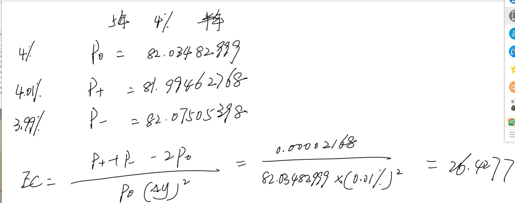 老师,这题中以5年期的债券为例,我计算出来的凸性是最后一个画问好的数,是我的方法错了么?