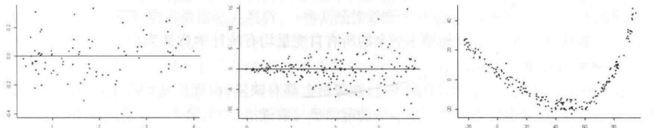 这是异方差,我找个图给您看一下,第一张图就是最好的状态,第二张图是异方差,或者说是方差不齐,第三张图说明y与xi之间不说线性关系,需要引入高次项代替。