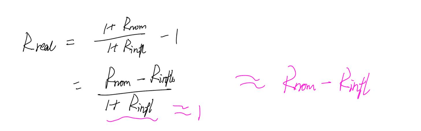 同学你好,如下图,由于利率比较小,所以分母的:1+Rinfl可以近似约等于1,所以可得出:实际利率约等=名义利率-通胀率。