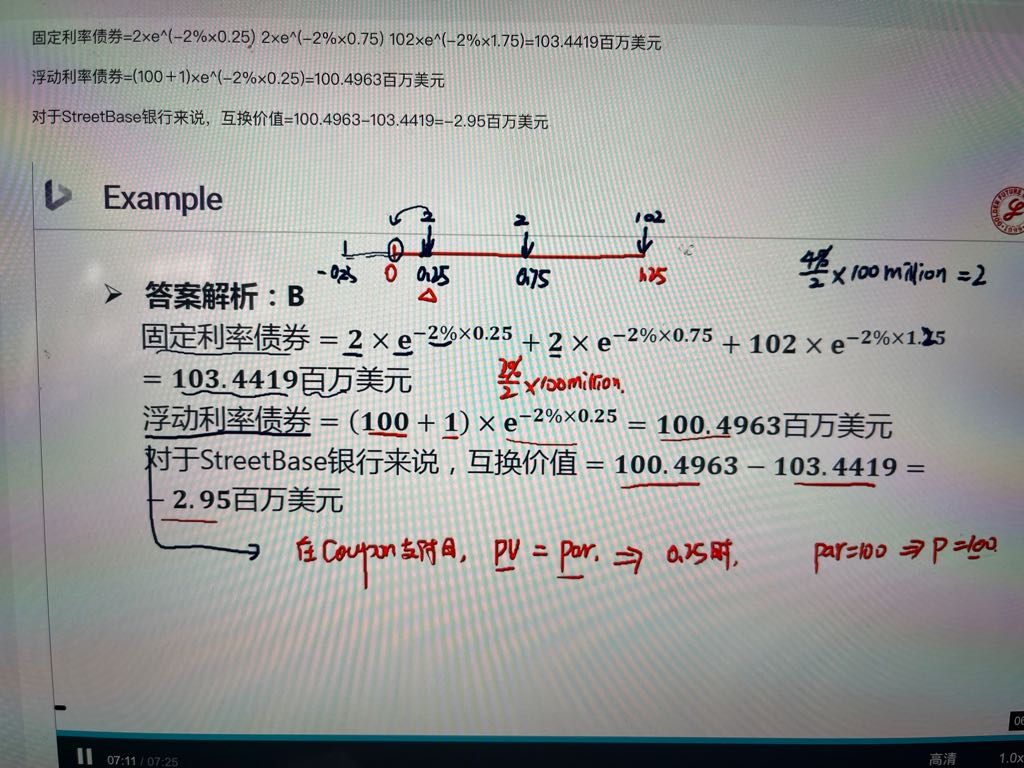 同学你好,对的。是固定利率债券在0时刻的价值,浮动利率债券在0时刻的价值。