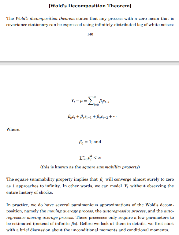 补充:MA模型来自于沃尔德分解理论,其认为一个去均值的协方差平稳序列可以写作无限阶滞后的白噪声按一定的系数进行加总。见下图。所以从最初始的角度出发,MA模型是对均值为0的序列进行建模;实践中很多序列的均值并不为0,可以对MA模型进行拓展,加入长期均值项。