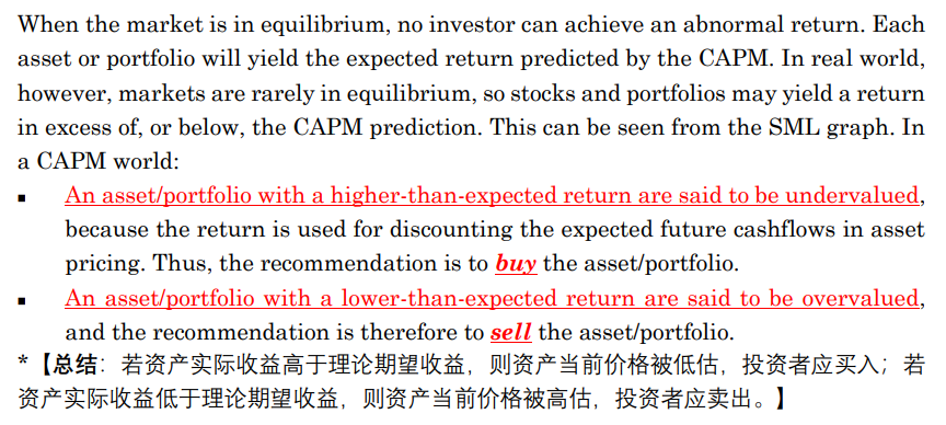 同学您好。同学的理解基本上是正确的。在CAPM框架下,我们认为CAPM算出的expected return即理论上均衡情况下资产应有的预期收益率(即该框架下“正确”的收益率)。SML上的值就是不同系统性风险水平下的CAPM的预期收益率。若资产的实际收益率高于CAPM的理论收益率,那么我们认为资产的价格被低估(收益率可被用作折现率,而价格与折现率呈反比);若资产的实际收益率低于CAPM的理论收益率,那么我们认为资产的价格被高估。