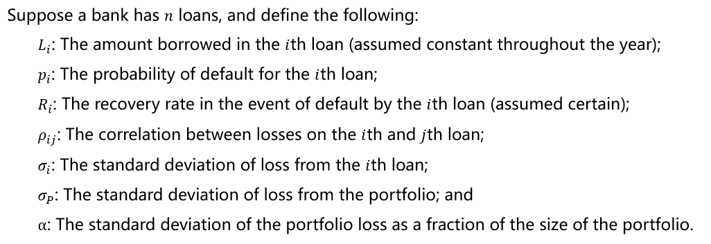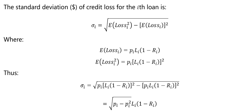 同学你好。该公式的推导详见下图。思路:Sigma_i代表组合当中第i个loan的损失的标准差。我们先求损失的方差:根据定义Sigma_i = E(Loss_i^2) - [E(Loss_i)]^2。其中,E(Loss_i^2) = p_i*[L*(1 - R)]^2 + (1 - p_i)*0,[E(Loss_i)]^2 = {p_i*[L*(1 - R)] + (1 - p_i)*0}^2。二者相减后开根号得到损失的标准差。这一套计算通过一些调整可以得到答案中的计算公式。