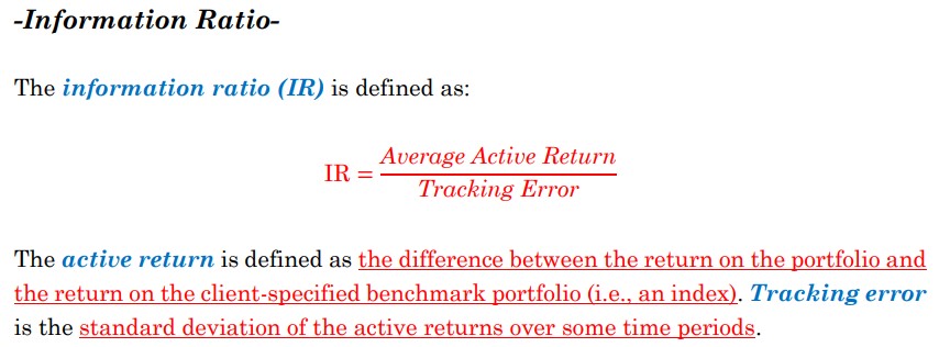 同学你好。Information Ratio的计算公式详见下图。其反映了每承担一单位积极风险(或者叫主动风险)所获得的积极收益(或者叫主动收益)。积极收益的标准差一般被称作Tracking error。但也有教材上会把这称作Tracking error volatility,而把积极收益称为Tracking error,这个取决于作者的习惯。建议同学按照FRM原版书的公式去记忆。