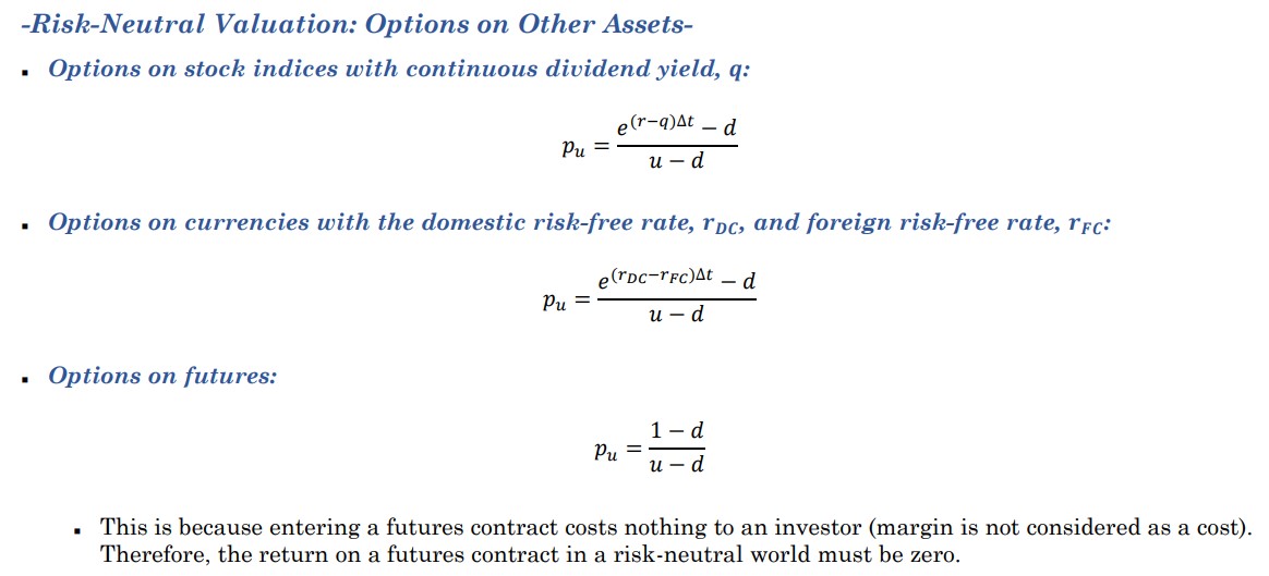 同学你好。这边例题中有dividend yield,在计算risk neutral probability时需要将其从无风险利率r中扣减掉,除此之外其他步骤均一样。这边授课老师应该是不小心笔误写漏了,造成的不便还请谅解。这边不同资产对应的概率计算给同学总结在图里了哈。