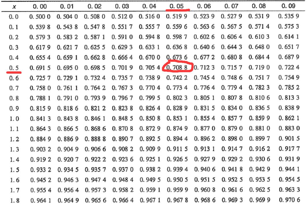 比如正态分布表,N(0.55), 先找左侧第一列,找到X=0.50这一行;在找第一行,找到X=0.05这一列。二者交点就是N(0.55)。如下图