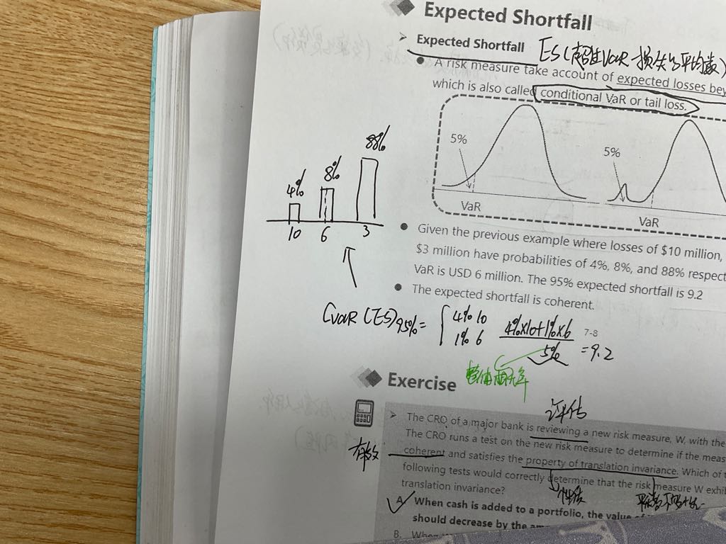 不当作整体的说法:对于尾部的10%,有5%的概率发生损失XXX,有5%的概率发生损失YYY。此时的概率还是无条件概率,我们需要调整到条件概率(ES本就是条件于损失大于VaR后损失的期望)。