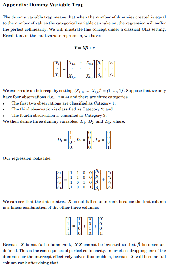 同学您好。对于哑变量陷阱,考试只需要同学掌握概念,不需要深入了解背后的原理。总而言之,比如我们考虑四个季度,各自赋予一个哑变量,I1, I2, I3, I4(例:I1 = 1 if in quarter 1, 0 otherwise)。此时跑季节性时间序列的模型,如果:1). 代表四个季度的四个哑变量全部被包含在模型中,以及2). 模型存在截距项,则出现严格完全共线性(Strict multicollinearity/perfect collinearity),模型参数无法被估计,这种情况被称作哑变量陷阱。以上两个条件任意取消一个都不会触发哑变量陷阱(只引入三个哑变量,或四个哑变量全部引入但去掉截距项)。至于哑变量陷阱的具体理论,需要同学有多元线性回归的矩阵表达基础,感兴趣的话详见下图。简单来说这个问题的根源就是当以上两个条件都存在的情况下,模型中的截距项是模型中哑变量的线性表出。