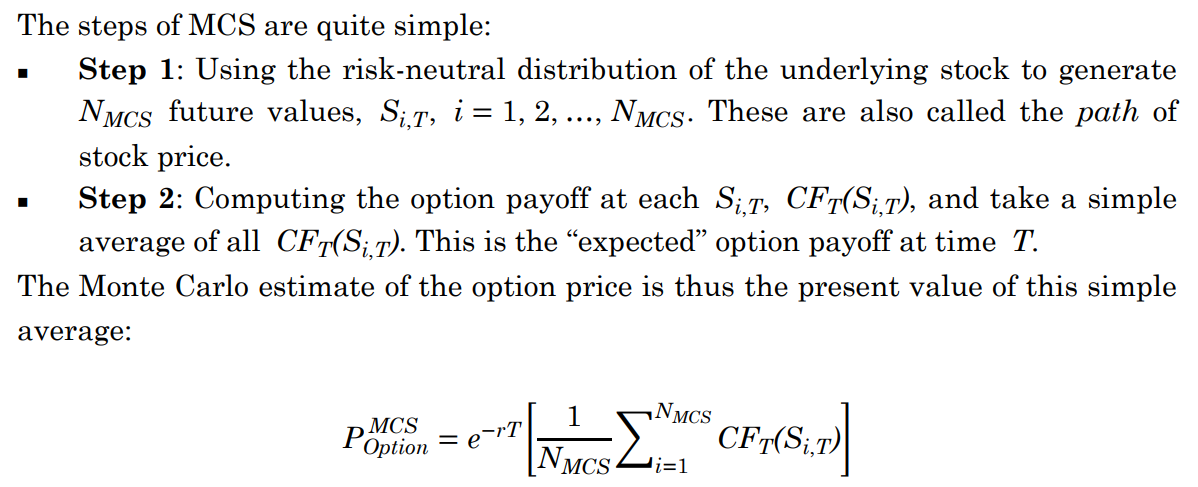 同学您好。是可能会这么考的。用蒙特卡洛模拟法给期权进行定价,一般都是假设股价服从风险中性下的某些过程(最常用的即几何布朗运动),然后进行股价的模拟。比如当前股价 = 50,我通过模拟可以得到一年后比如5,000个可能的结果{S_1, S_2, ..., S_5,000}。然后我再根据期权的执行价格、算出每个结果下期权的payoff。将这些payoff取平均滞后再按无风险利率折现回来就可以了。这里无非就是好几个分析师都在做蒙特卡洛模拟,最后将结果汇总了。