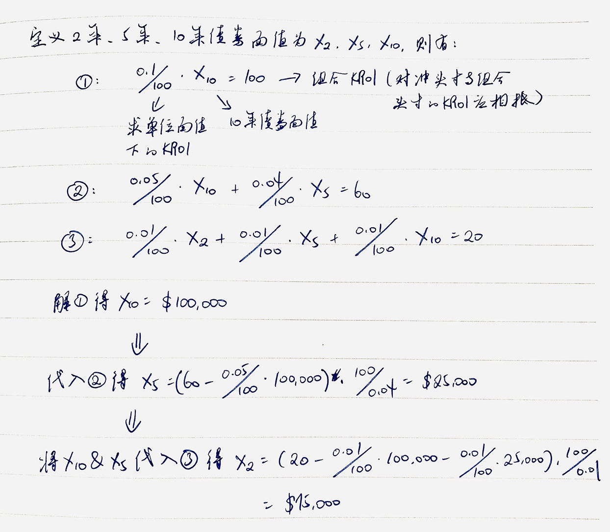 讲义是和对冲债券加起来是0,而且讲义上每个kr01都用了3个债券,这个题里为什么10年的可以就用一个债券?