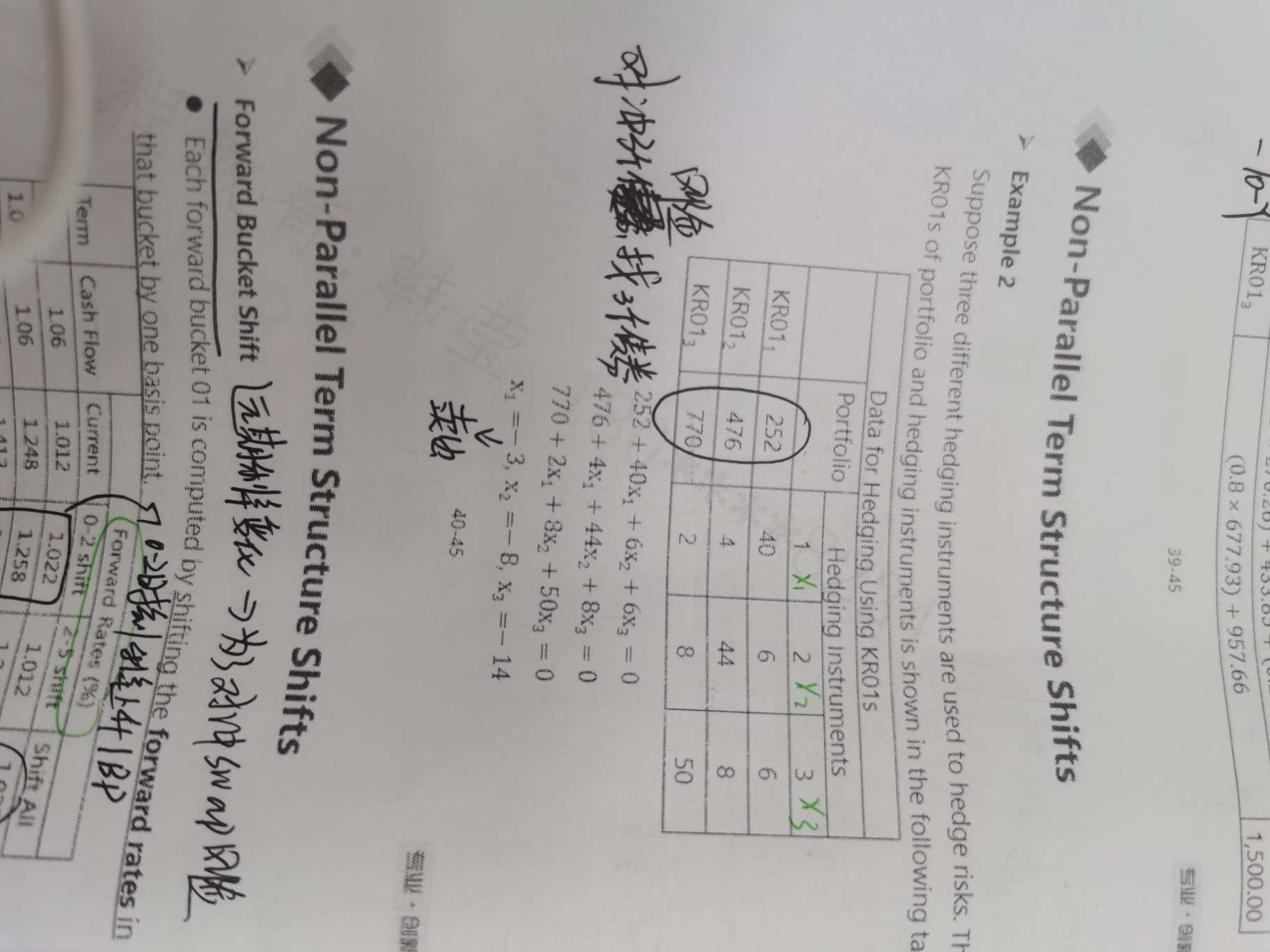 题目1:首先根据当前的flat forward rate curve以及其它信息计算出债券价格 = 5000/1.03 + 5000/(1.03*1.03) + 105000/(1.03*1.03*1.03) = 105,657.22;再假设0-2 years bucket不变(0-1和1-2的forward rate还是3%),2-3 years bucket上升1基点(2-3的forward rate上升1基点,变成3.01%),求新的债券价格 = 5000/1.03 + 5000/(1.03*1.03) + 105000/(1.03*1.03*1.0301) = 105647.89。计算价格变换105657.22 - 105647.89 = 9.33即为这里要求的forward bucket 01 (2-3 year)。