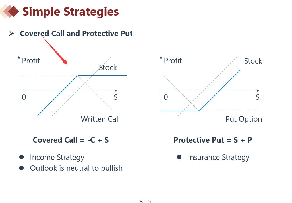 备兑看涨期权,主要是卖出看涨期权和买入标的资产来构造的策略。也叫收益策略,是先通过看涨期权获取收益,然后再通过标的资产来对冲的一种交易策略。卖出看涨期权,赚取的是期权费,再通过买入股票来做对冲。