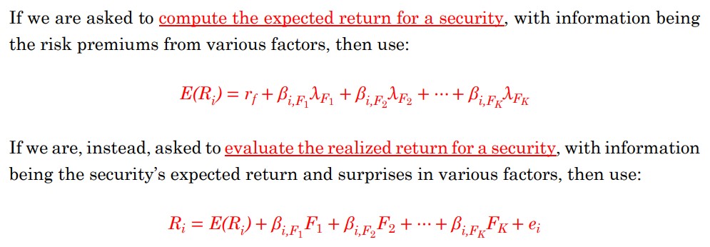 对于APT,主要考点有下图中的两类公式,同学考试的时候根据题目给的具体信息可以进行判断使用哪个公式。其中lambda指的是因子的risk premium,F指的是因子的shocks。