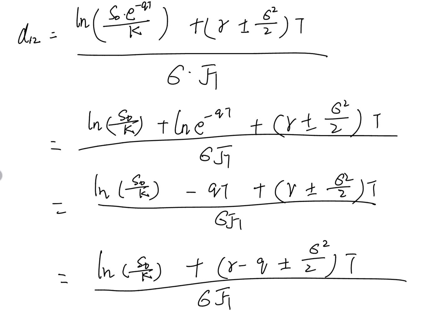 同学你好,这只是最后的表达式。在计算d1和d2的时候,里面还有q的。如下图,