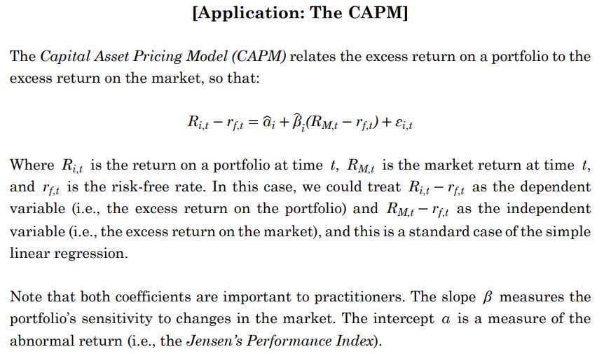 同学你好。这里说的是regress Portfolio (P) excess returns against the Benchmark (M) excess returns,就是将组合的excess return对benchmark的excess return作回归。这是典型的CAPM实证研究回归,如下图所示。更加全面的表述是excess return over the risk-free rate。换个思路,如果这里的excess return是excess return over the benchmark,那么自变量X全部取值都应为0,回归也就没法做了(回归要求自变量X是会有变动的,不能是一个常数;这个不是考点,稍微了解一下就可以了)。