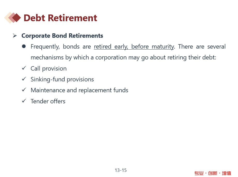 同学你好。在第三门课Financial Markets and Products中介绍债券的基础知识部分有提及,见下图。Debt retirement指的就是债券的发行方如何偿还债务,这里比较重要的是如何在债券到期之前偿还债务,涉及一些比较特殊的偿还方法比如sinking fund、call provision等。