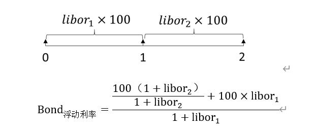 如下图:要算浮息债的价值,就是未来现金流贴现求和,在这里不能把2时刻的现金流直接折现到0时刻,因为在0时刻投资者不知道投资者2时刻支付的现金流是多少,投资者只有在1时刻才能知道,所以,直接计算期初价值是不现实的,投资者在计算浮息债价值的时候,要用一个迂回的方式,先折到1时刻,在1时刻的时候投资者可以知道1-2时刻的利率,再加上1时刻的利息现金流,再折到0时刻,所以浮息债的价值计算,是用先折一期再折一期的方式计算出来的,一般用一般复利来进行计算。假如说投资者现在要计算浮息债0时刻的价值,浮息债的价值=100