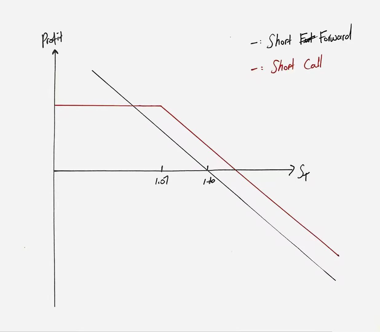 同学你好。这个题其实展开讲比较复杂,是在研究用forward对冲和用期权对冲哪种方法好、在什么时候好。见下图。