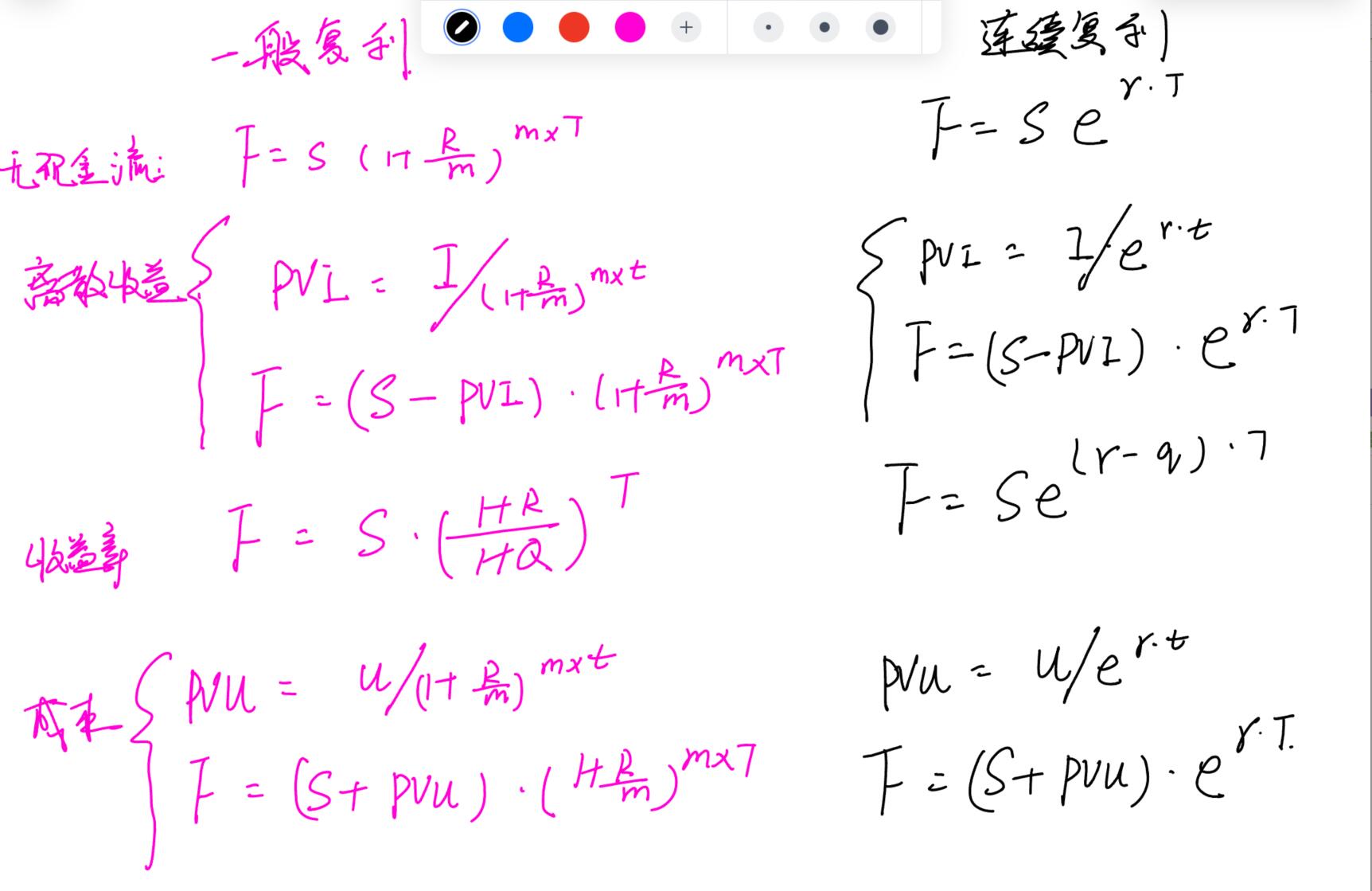 课件讲得都是一般复利的情况,请老师把一般复利的几个不同场景(无成本,无收益;有离散收益;有收益率;有成本)替换成连续复利的场景(我做题的时候遇到的是连续复利场景),并分别列出各个场景下的计算公式。谢谢。