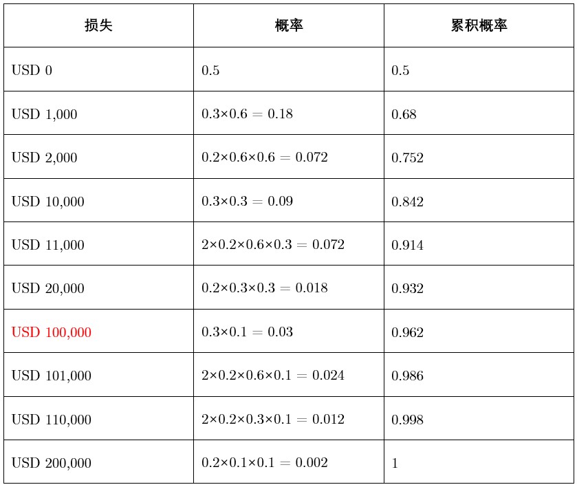 损失为$10000的概率 = 0.3(发生一个损失的概率)*0.3 (该损失为$10000的概率)= 0.09