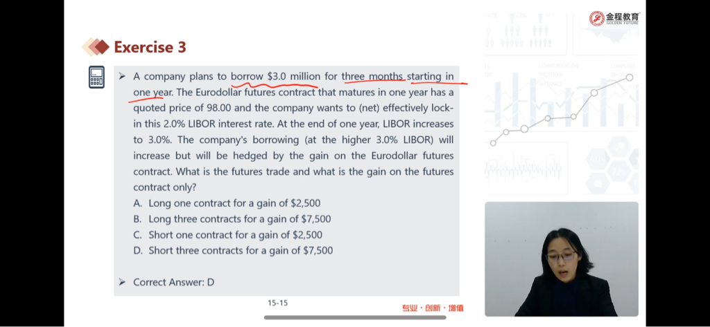 同学你好。这个还是要具体题目具体分析,同学可以上传一下有疑问的题目。一般来说,由于Eurodollar futures的价格在利率下降时上涨,在利率上涨时下跌,因此做多Eurodollar futures主要是对冲利率下降的风险,做空Eurodollar futures主要是对冲利率上涨的风险。