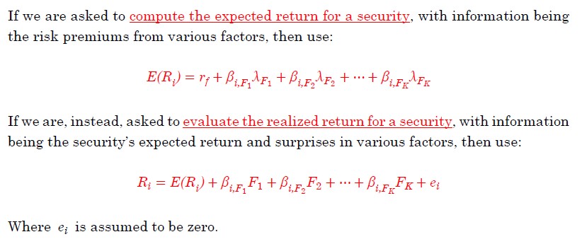 同学你好。这里的考点一般分为两类公式,详见下图(其中lambda指代的是因子的risk premium,F指代的是因子的shock)。在求资产的expected return时,我们用的是rf + beta*risk premium这一类型的公式;有时题目也会直接给出资产的expected return,要求根据实际观测到的因子水平与预计的因子水平的不同(也就是shocks)来对该expected return进行修正,或者也有题目会说根据expected return和shocks求出资产的realized return。这里考察的是后者。