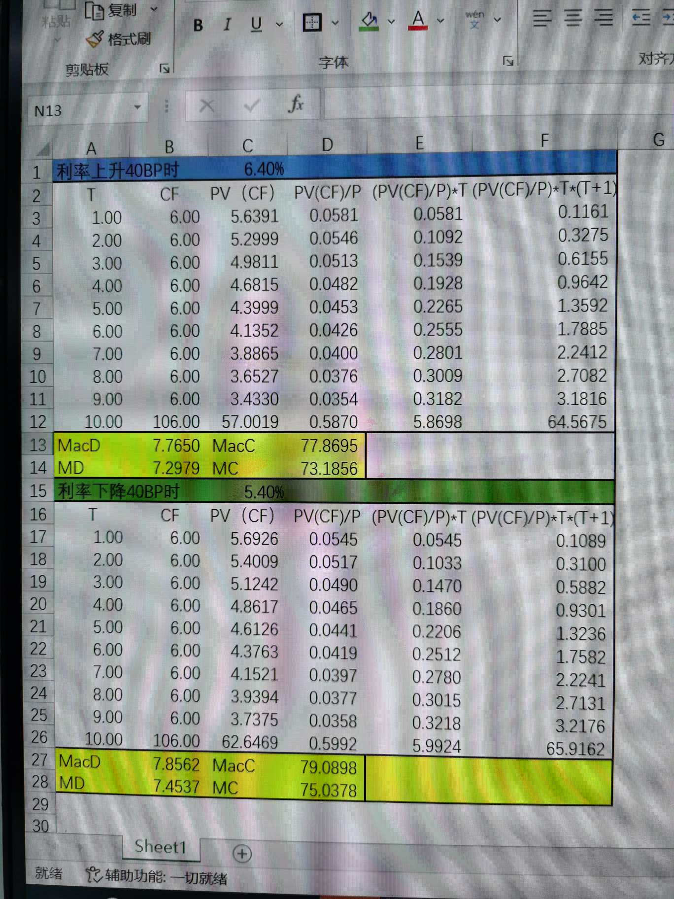 2.我按照普通久期和凸性的公式计算了一遍利率上升时的结果(详见截图),和你的计算结果有差异,不知道哪里有问题,请帮忙看一下。