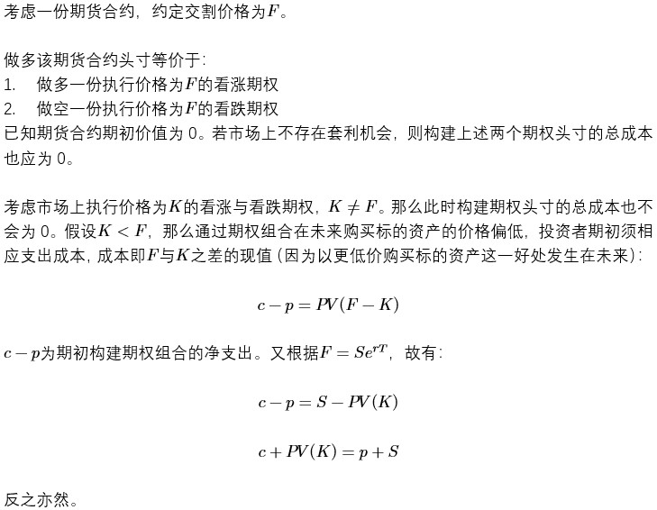二:见下图。这种方法是建立在买入看涨 + 卖出看跌(执行价与到期日相同)等价于买入一份期货合约(因为未来不论情况如何,该期权组合都会买入标的资产。当S > K时,看涨期权行权,看跌期权的对手方不会行权,买入标的资产;当S < K时,看涨期权不行权,看跌期权的对手方会行权,依然是买入标的资产)。