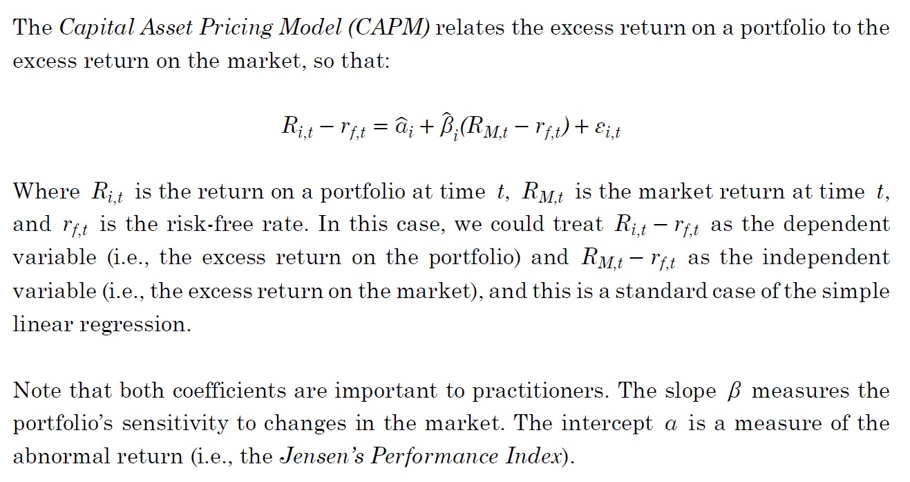同学你好。这个涉及CAPM本身的回归形式,稍作了解即可。CAPM模型为E[Ri] = Rf + beta(i)*[E[RM] - Rf]。将Rf移到等式的左边,即可得到E[Ri] - Rf = beta(i)*[E[RM] - Rf],这是一个典型的回归框架,其中自变量为市场组合超额收益E[RM] - Rf,因变量为资产i的超额收益E[Ri] - Rf。见下图回归公式。根据该设定,这道题本质上就是让我们根据回归模型对因变量进行预测。