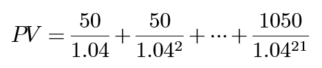 同学你好。这里的计算公式见下图。在计算器上,使用知四求一的方法将四个已知要素分别输入、再求解未知的PV即可。步骤如下:[2ND] -> [CLR TVM] -> 21 -> [N] -> 4 -> [I/Y] -> 1000 -> [FV] -> 50 -> [PMT] -> [CPT] -> [PV]。金融计算器中正数为现金流流入,负数为现金流流出,因为我们输入的现金流均为正数,这意味着未来都是现金流入,所以期初我们需要花钱买入这样一个资产。而这里‘花钱’意味着现金流出,所以PV计算出来就是负数。这是金融计算器的一个内嵌设置,在做题的时候主要还是关注数值即可。