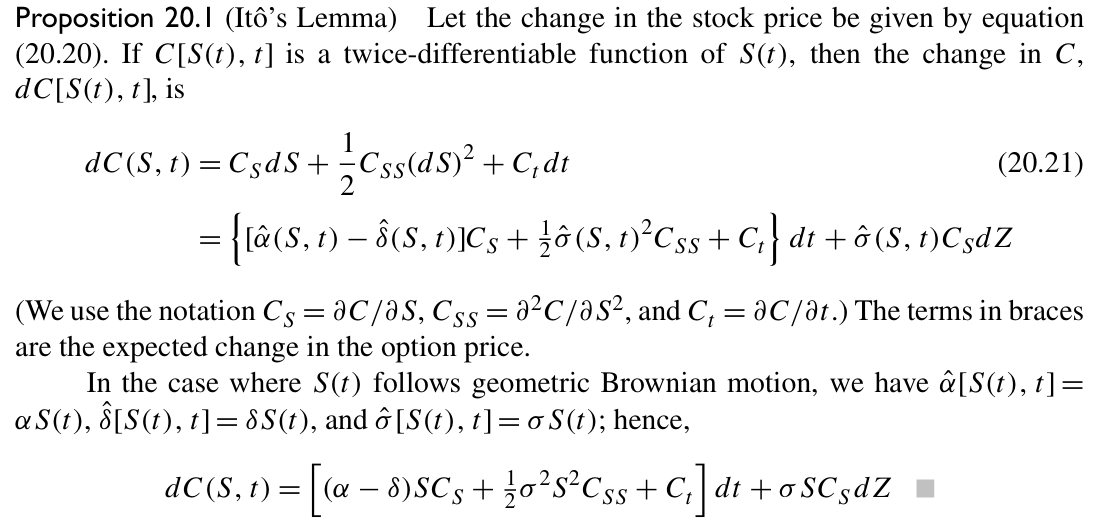 BSM的推导是基于股票价格服从几何布朗运动的假设进行开展的。通过伊藤引理(Ito´s Lemma),我们可以通过股票价格服从的随机过程(stochastic process)推导出期权价格服从的随机过程,也就是该课件上第一个公式。伊藤引理详见下图。而基于期权价格服从的随机过程,Fischer Black和Myron Scholes于1973年推导出了无套利情况下期权价格所必须遵循的一个偏微分方程,称为Black-Scholes partial differential equation(BSPDE),也就是图中第二个公式。BSPDE描述了每时每刻期权价格在无套利情况下应遵循的等式,在此基础上,如果我们能够知道某一时点上期权确切的价值,那么就可以解出每时每刻的期权价格。比如对于欧式看涨期权,我们知道其在到期日时的价值,即Max(S - K, 0)。结合这一条件(称作边际条件,boundary condition)对BSPDE进行求解,可以得到唯一解析解,也就是BSM期权定价公式。