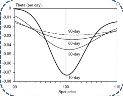 同学你好。这道题的考点在于,随着到期日的临近,哪种类型的期权会经历“accelerating time decay”,也就是随着时间的流逝期权价值跌得越来越快。只有ATM option(以及接近ATM的期权)会经历accelerating time decay,其它期权的话都是decelerating time decay,这一点可以直接从下图中看出。