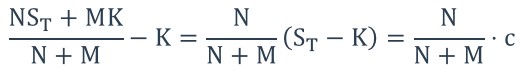 同学你好。这里需要搞清楚课件上公式本身的含义。(N*ST + M*K)/(N + M) - K = [N/(N + M)]*(ST - K)这一部分计算是帮助我们印证了如下结论:不论如何,warrant到期时的payoff等于一个同样条件下的看涨期权的payoff乘以N/(N + M)。既然到期时的payoff呈现如此关系,那么当前二者的价值也应呈现如此关系:Value(Warrant) = [N/(N + M)]*Value(Call),也就是最右边这一公式。对于warrant价值的计算,直接使用最右边这一公式即可,不用看其它条件。