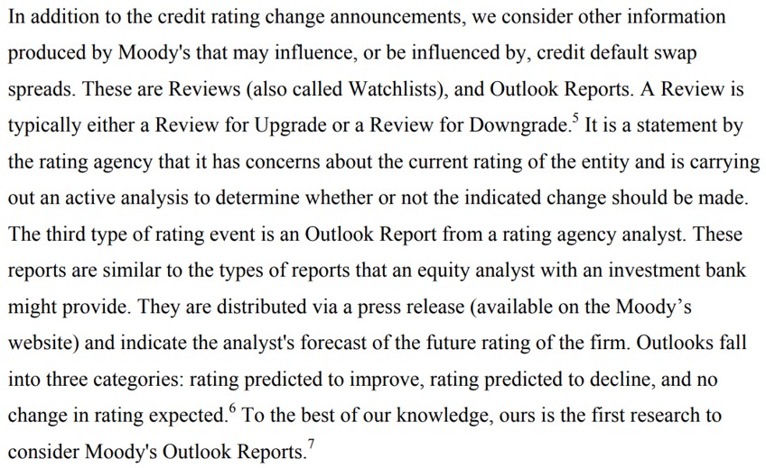 我在Moody´s相关的文章里摘抄了以下截图。我的理解是,因为一家公司被列在watchlist review里面,也就是说评级机构正在评估它的评级(Moody´s 将在90天内完成最终评级回顾)。而如果恰巧此时有CDS spread的上升的话,那么正在接受评级回顾的的这家公司在接下来被评级下调的机率极大。如老师所说,如果每家公司的评级是定期的,那么在watchlist review当中的公司应该会最快受到影响。