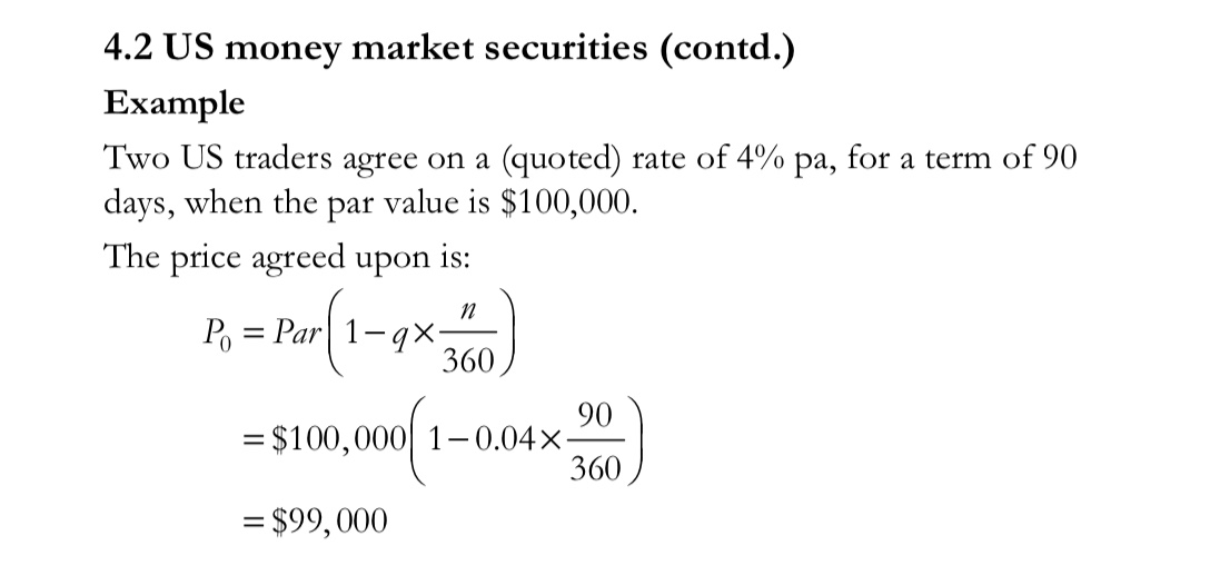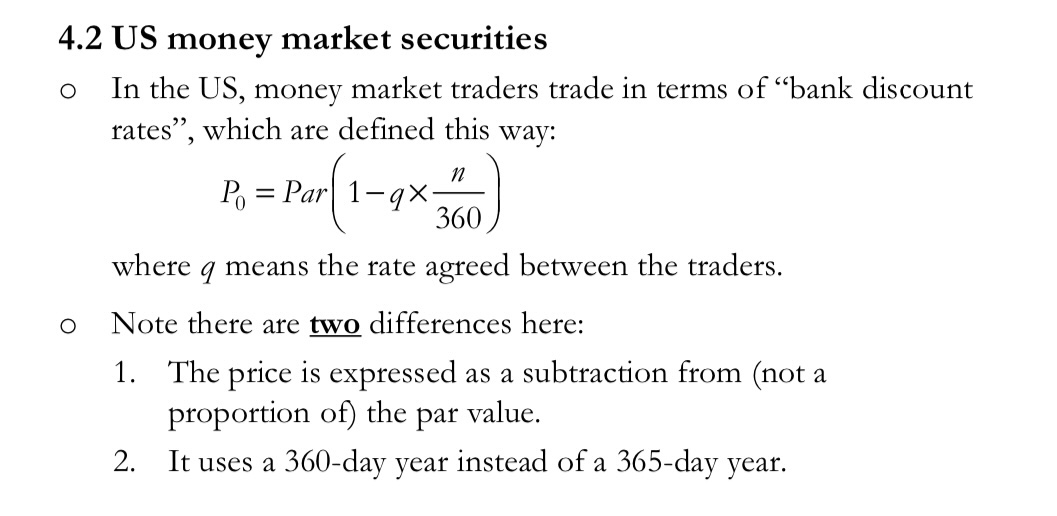 同学你好。美国国债的报价方式分为对于到期时间在一年及一年以下的(Treasury bill/Money-market instrument)和一年以上的(Treasury note & Treasury bond)。其中,对于T-bill,其报价通常采取报利率的形式。定义见图1,例子见图2,其中q就是报的利率。对于T-note & T-bond,需要掌握clean price, dirty price和accrued interest三个概念分别是什么以及之间的区别。其中,未来现金流折现求和(也就是理论上债券的价格)是dirty price,但是dirty price受coupon的影响,每到coupon payment date都会发生回落,这对于投资者分析债券价格来说属于是“噪音”。因此,T-note & T-bond的报价采取从dirty price中消除coupon的影响,也就是减去accrued interest,用二者之差(也就是clean price,clean price = dirty price - accrued interest)进行报价。示例图见图3。