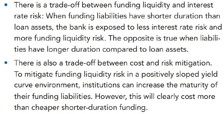首先,如果负债的期限低于资产的期限,那么在负债到期时,资产这边可能还没有足够的现金流入,这时我更应担心的是融资流动性风险,也就是没有足够的钱去满足现金流需求的风险。但同时,负债的期限短,利率风险更低,所以市场风险相对来说更不重要一些(这个在后续课程中会学到,可以看到书上用的是duration,久期,当前阶段你可以暂且把它理解成期限,它们是很接近的概念;但是更重要地,久期是衡量债券的利率风险的重要指标)。反之,如果负债的期限更长,那么在负债到期时,资产的现金流已经全部回流了,也就更有可能从容应对负债的偿还,所以融资流动性风险低。但是,由于负债的期限长,利率风险更高,所以我们更关注的点就在市场风险上了。注意这里的讨论是集中在负债端上的,没有去考虑资产端。