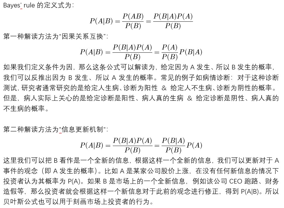 同学你好。从数学的角度来看,Bayes´ rule就是对条件概率的定义式进行了一个变换,但是这样一个简单的变换却有着很多不同的解读方法,见下图。至于如何在题目中判断使用哪个公式,需要同学根据题目信息进行分析。首先,对于条件概率和Bayes´ rule,求的肯定都是条件概率,但是Baye´s rule涉及的概率多一些,题目中的信息也就会相应多一些。如果发现题目根据简单的条件概率公式算不出来,那就要使用Bayes´ rule了。