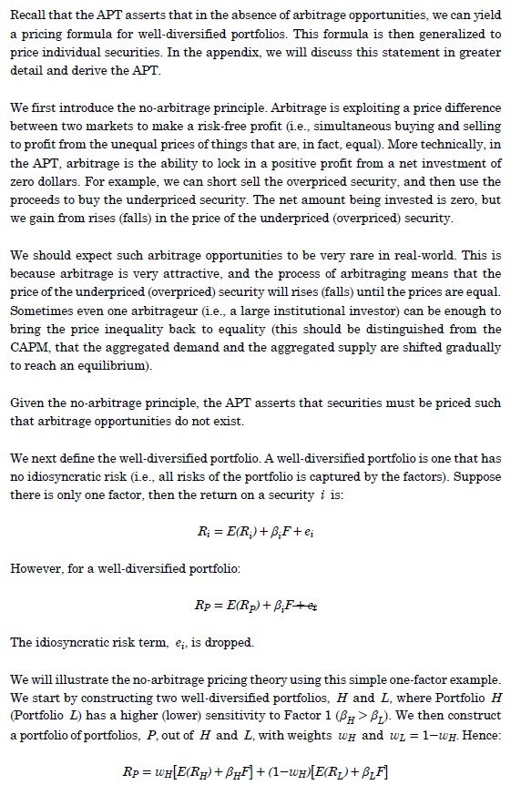 同学你好。APT的套利思想比较复杂,严格来说它识别的是well-diversified portfolios之间的套利机会。简单来讲,我们可以用两个well-diversified portfolios构建一个新的´portfolio of portfolios´,而在某特定权重下,我们可以将factor的影响冲抵掉,使得整个portfolio of portfolios无风险。而无风险的组合当前的价格必然等于未来期望payoff按无风险利率折现。如果用无风险利率计算出来的组合价格与市场不符,则认为存在套利机会。详见下图推导,考试不会考这么深的,记忆结论公式即可。