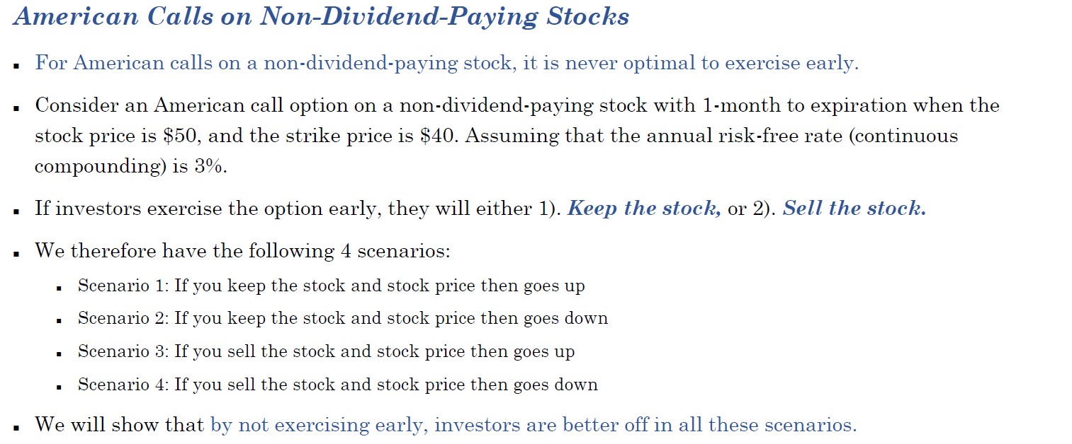 同学你好。在标的资产为无股息股票时,可证无论如何我们都不会提前行权,【提前行权不如直接卖权】。见下图。如果投资者提前行权,一共有四种可能情况:1. 投资者持有股票,股票价格后续上升;2. 投资者持有股票,股票价格后续下降;3. 投资者不持有股票、将其卖出,股票价格后续上升;4. 投资者不持有股票、将其卖出,股票价格后续下降。根据下图中的信息,我们可以对每个场景进行分析。