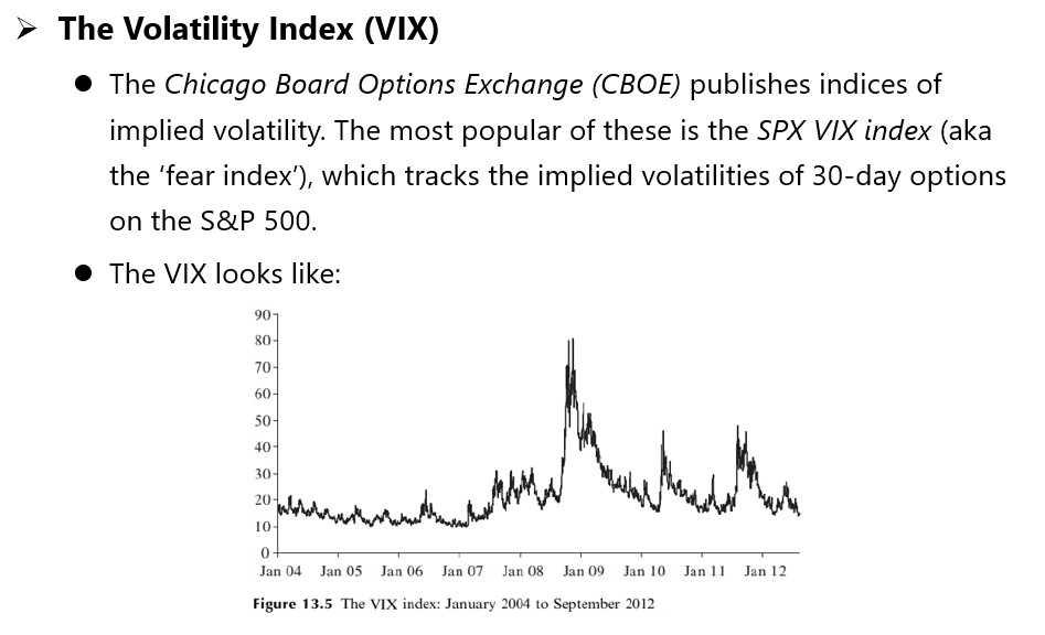 同学你好。见下图。VIX衡量的是市面上以某股指(如S&P 500指数)为标的的,在一个月内到期的期权它们的隐含波动率的一个加权平均,反映的是整体市场上对股指在未来一个月的波动率的预期。比如说VIX现在等于20,那这就意味着整体市场预期未来一个月股指的波动率是年化20%。