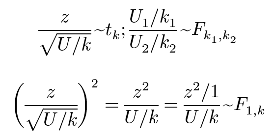 同学你好。正确的,一元情况下F检验等价于t检验,F-statistic = (t-statistic)^2。这个背后是t和F的统计学关系,见下图(其中z是标准正态变量,U为自由度=k的卡方变量),记住结论即可,不必深究。