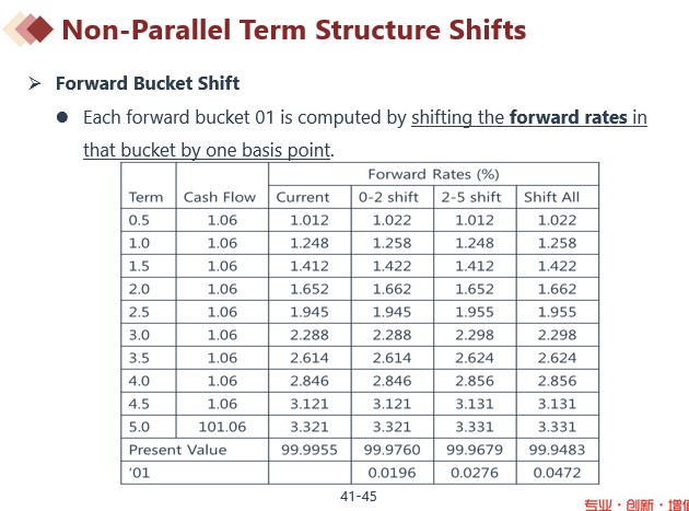 同学你好。见下图。Forward bucket 01说白了就是一系列相邻的forward rate同时变动1个基点导致的债券价格的变动,没有什么新东西,通过两道题目进行练习就可以了。