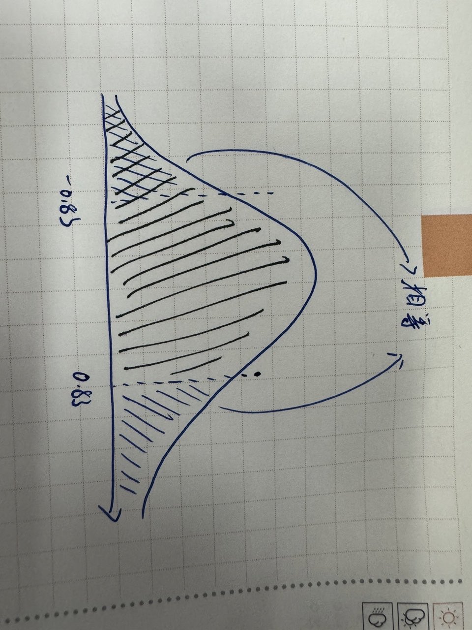 老师,为什么N(0.83)+N(-0.83)=1? 我理解的N(0.83)=N(-0.83),可不可以用正态分布图标注一下,给我解释一下两者之和=1?前面的知识点有点忘记了