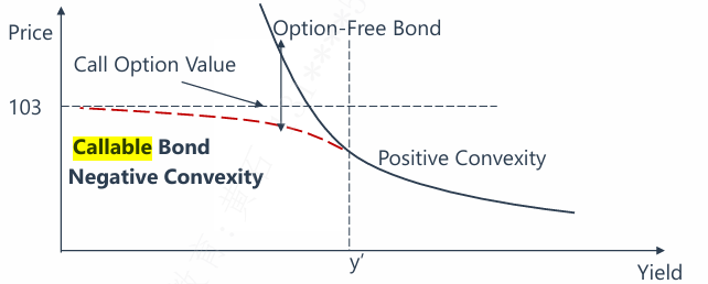 同学你好。对于callable bond的理解可以参照下图。随着利率下降,债券价格会上升,但是callable bond的价格被行权价锁死了,最高就只能涨到这么高,再高就会赎回。因此,价格会呈现图像上的走势,可见图像中在利率下跌的这部分曲线是concave的,或者说convexity是负的。Callable bond定义中的这句话也是在描述这张图,随着利率的下降,债券的价格上升,但这个上升的速率越来越慢,这就是在描述这里这个concave或者说convexity为负的图像。