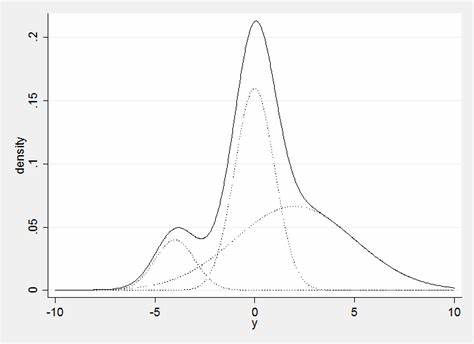 同学你好. 混合分布是对分布的加权平均, 尽管这里两个分布的权重都是0.5, 但由于他们本身的均值和方差不同, 所以混合后会呈现这种比较奇怪的图像. 下图是三个正态分布的混合, 三个分布的均值和方差均不同. 从图像的角度上来说, 对分布赋予一个权重, 其实就是将这些分布按照权重等比例缩放 (比如权重是0.5, 那么原先的分布它的PDF所有取值都会变成原先的一半, 然后再去和其它分布进行混合).