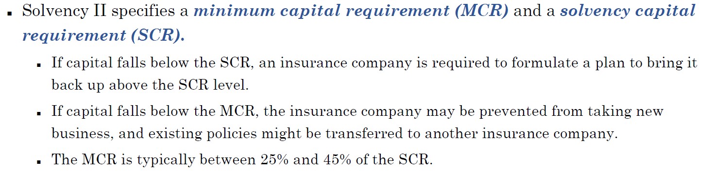 同学你好。总结见下图。取决于不同的capital requirement,Solvency II对保险公司的要求也不同。Solvency capital requirement可被视作是一道良好线,未达标的话保险公司需要提交一份补足保证金的计划。Minimum capital requirement是一道及格线,未达标的话保险公司就不能接业务了,甚至已有的业务也要转给其它保险公司,这个的结果比较严重。这些是Solvency II的要求,记住即可。C的话把minimum capital requirement换成solvency capital requirement就对了。