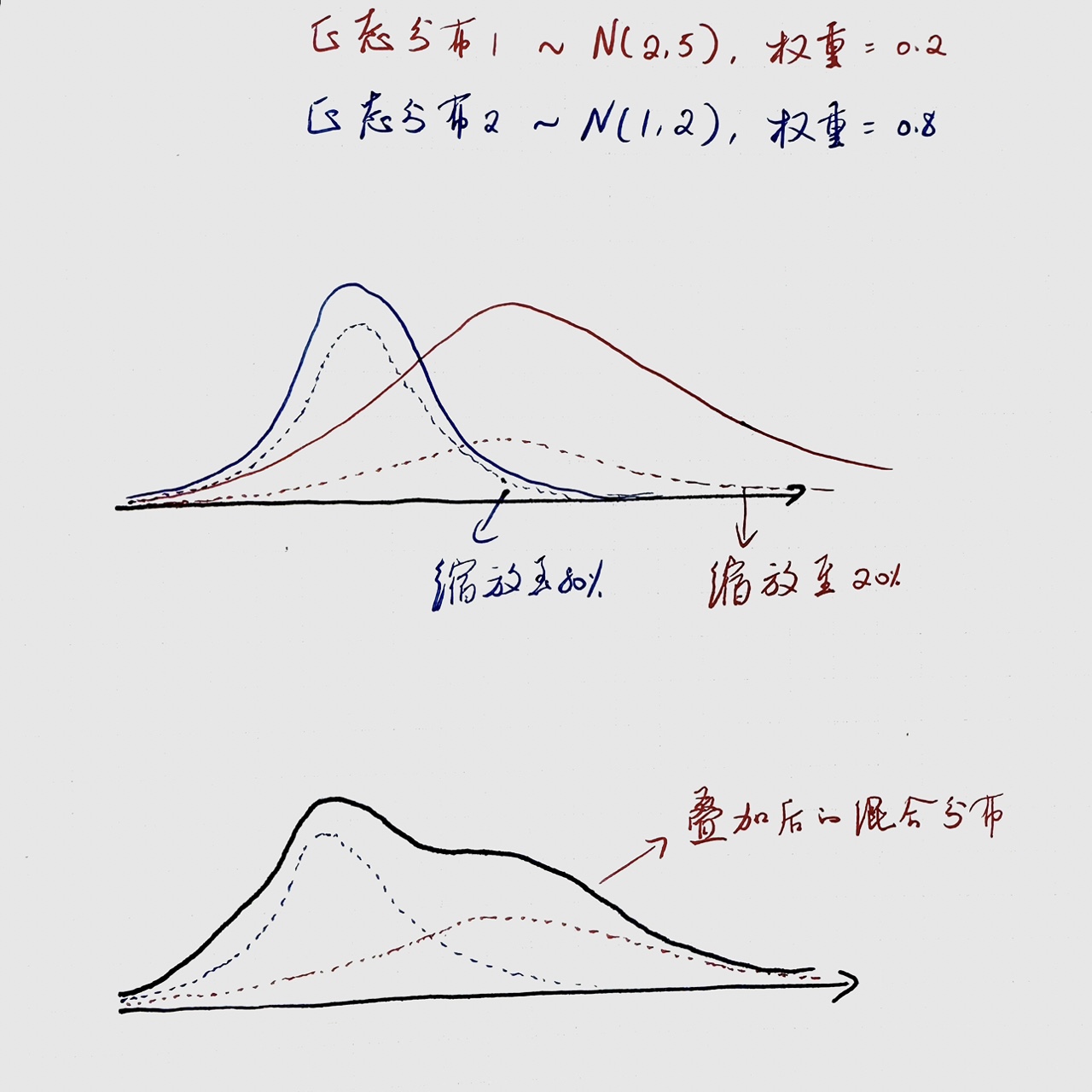 同学你好。因为不同正态分布的位置(由mean决定)和分散程度(由variance决定)不同,因此将它们混合之后(体现在图像上就是将不同正态分布按权重缩放后叠加起来)得到的混合分布也不会是正态。见下图。