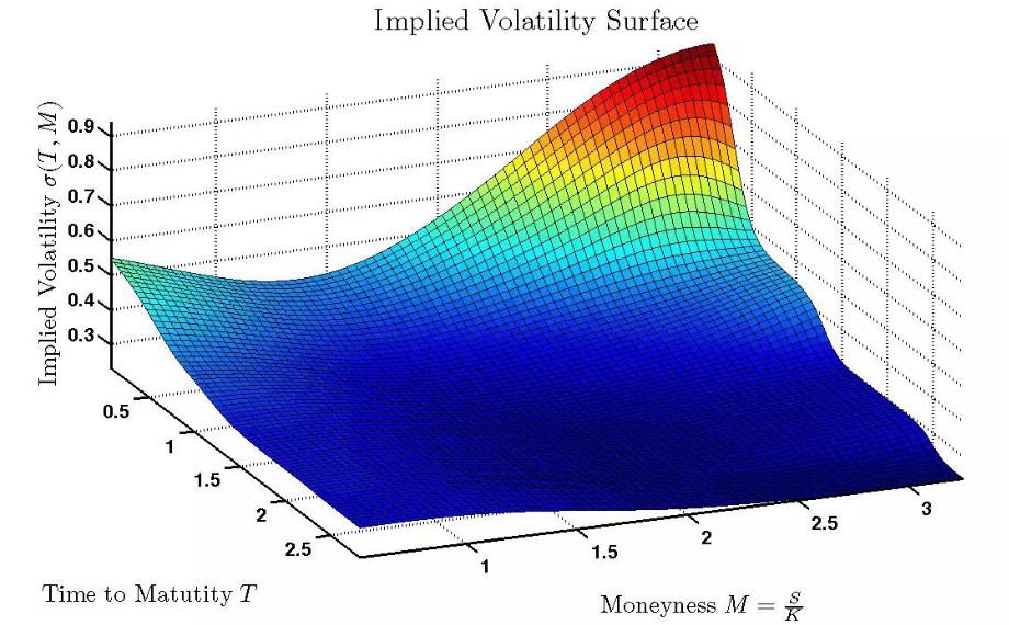 同学你好。这个需要区分理论和实际。理论上,在BSM模型的世界中,不论strike price,也不论maturity,只要是相同标的资产的期权,隐含波动率就应该一样。因为标的资产都是同一个,波动率就是sigma。但现实中,由于BSM模型的假设通常不成立,所以strike price不同,或者maturity不同,即使标的资产都是相同资产,期权的隐含波动率也是不同的。我们通常将strike price(或者某些strike price的变体)、maturity这两个维度和implied volatility同时画在一张图上,称作volatility surface,见下图。