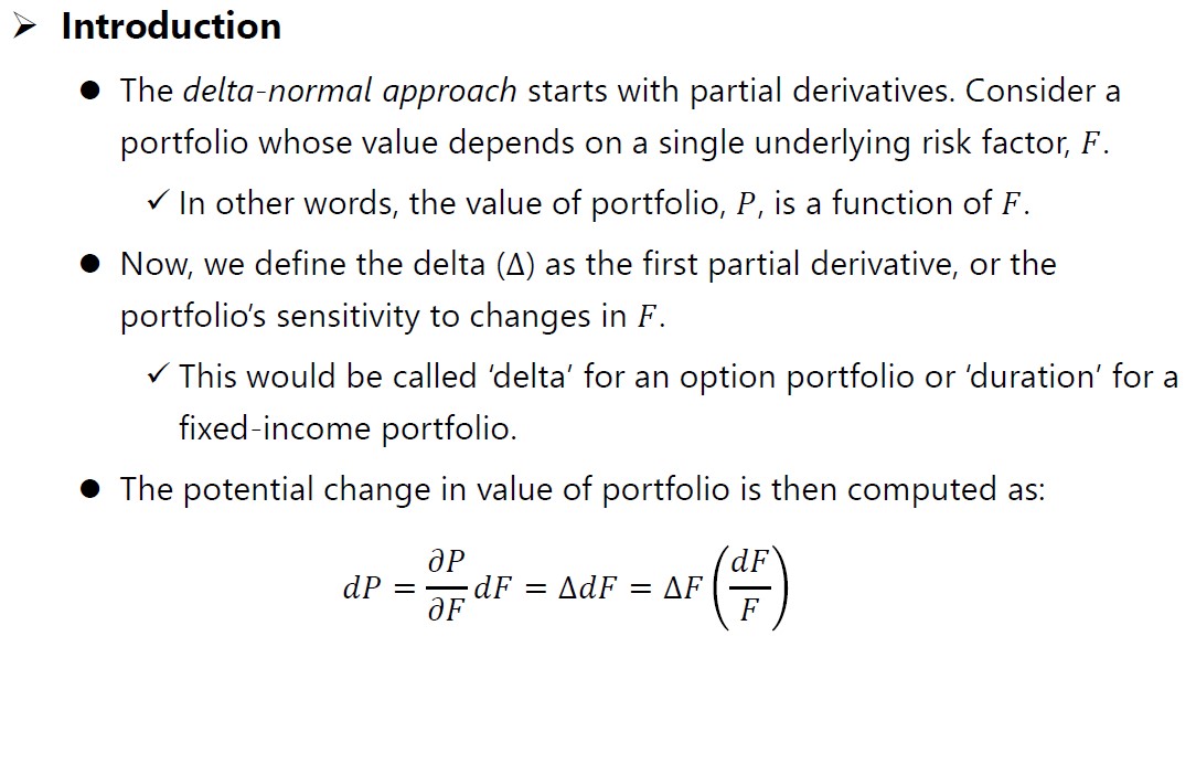 同学你好。Delta-normal法简单来说就是在正态分布的假设下,通过底层风险因子(如股票、利率等)的VaR值以及敏感性指标,去计算诸如衍生品、债券之类的产品的VaR值。见下图。